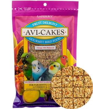 Fruit Delight Avi-Cakes have the taste and texture that your birds love! Includes wholesome fruits and grains mixed 50% with nutritious pellets.
