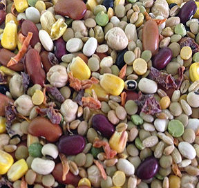 Whole Corn, Flaked Corn, Brown Rice, Wheat, Pearl Barley, Green Peas, Yellow Peas, Navy Beans, Black Beans, Red Kidney Beans, Lentils, Pinto Beans, Garbanzo Beans, Black Eyed Beans, Small Red Beans, Chili Peppers & Carrots.