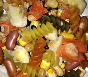 Spinach Pasta, Tomato Pasta, Corn, Brown Rice, Wheat, Black Beans, Pinto Beans, Cooked Soy Beans, Red Kidney Beans, Rolled Corn, Banana Chips, Peanuts, Hazel Nuts, Brazil Nuts, Pignoli, Cranberry, Pepitas, Dried Apple, Dried Apricot, Dehydrated Carrots, Spinach, Leeks, Chili, Sweet Basil.