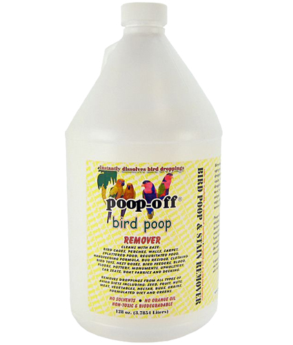 Liquid Poop Off solution with organic enzymes quickly dissolves bird droppings not only on bird cages but also on floors, walls, carpet and clothing.