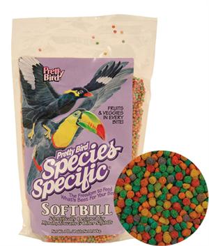 Simplifies the feeding and management of softbill birds such as mynahs and toucans. Manufactured with fructose which is a naturally occurring ingredient in fruit in a smaller shaped nugget. Our iron levels are less than 60 Ppm, which is well below the safe maximum levels currently recommended. Softbills love fruit which should be offered on a daily basis. 18% protein and 8% fat.